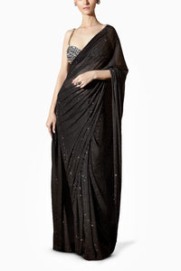 Featuring Layla Saree Set by ITRH from their Titi Collection. Black crystal embellished prestitched saree paired with a silver blouse featuring striking big stones.
