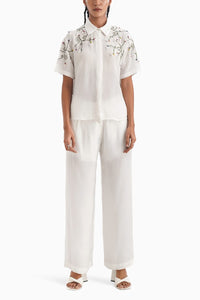 Impeccable design and meticulous craftsmanship ensue in le jardin vine embroidery co-ords from Notre Ame. Handcrafted in ivory crepe de chine, the shirt brings alive delicate hand embroidered floral vines. Flattering straight fit pants combine for a timeless sophisticated look. The elegant ivory ensemble effortlessly falls on the body alluding a chic style.