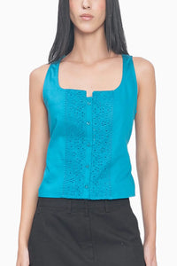 Featuring a sleeveless square-neck design, this embroidered top offers a front button closure and a self-tie belt at the waist for a touch of definition. Crafted in a relaxed fit, it ensures effortless style and all-day comfort.