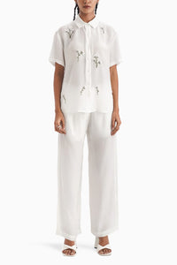 Hand embroidered elderberry flowers blooms on this crisp crepe-de-chine co-ords. Le sureau ivory embroidered co-ords from Notre Ame delicately falls in a flattering silhouette. The relaxed fit timeless outfit offers a minimal and exclusive yet sophisticated look for your outings.