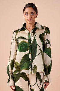 Breeze through the season in this sheer organza top, adorned with an exclusive hand-rendered leaf print. Featuring a fluid silhouette and a nature-inspired palette, this piece blends effortless elegance with a modern botanical charm — perfect for refined day-to-evening dressing.