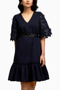 Exude effortless elegance in this chic V-neck dress, designed with delicate leaf-patterned sheer sleeves that add a touch of ethereal charm. The soft, flowing fabric of the sleeves beautifully contrasts with the structured bodice, creating a balanced, graceful look. The ruffled hem enhances the dresses feminine appeal, offering movement and texture. Perfect for both daytime events and evening outings, this dress combines modern sophistication with timeless style, making it a versatile addition to any wardrobe.