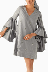 A breezy gingham mini dress with a flattering V-neckline and playful flared sleeves. Delicate embellishments add a subtle sparkle, making it perfect for both casual and semi-formal occasions. The relaxed silhouette ensures comfort, ideal for summer brunches, vacations, or evening outings. Pair it with espadrilles for a casual look or heels for a chic finish.