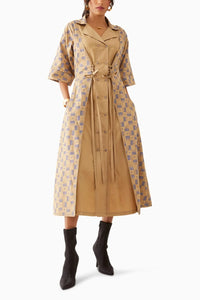 The Leah Dress is a refined blend of print and solid fabric, offering a timeless yet contemporary appeal. Crafted in our signature Clockwork print, the sand-colored dress features a classic lapel collar and intricate paneling that adds structure and elegance. A versatile tie-up detail at the waist allows for a customizable fit, letting you cinch it for a more defined silhouette. Perfect for day-to-evening transitions, the Leah Dress strikes the ideal balance between effortless style and thoughtful design.