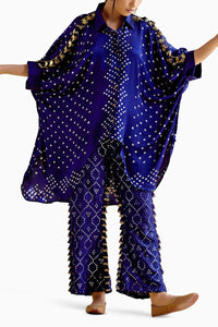 Featuring Leander Blue Co-ord Sets by 5 Elements by Radhika Gupta from Mitti Collection. Make a statement with these tassel-adorned pants, crafted from comfortable fabric. Pair them with the oversized blue kaftan shirt, handcrafted from modal Saturn with bandhini, accentuaing coin and ghungroo embellishments, and carefully crafted tassels for a bold, boho vibe.
