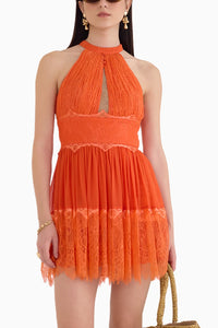 Featuring the Lelia Short Dress by House Of Exotique. This orange halterneck lace dress boasts a fine draped design with a keyhole detail and a zipper fastening. Tailored for a perfect fit.