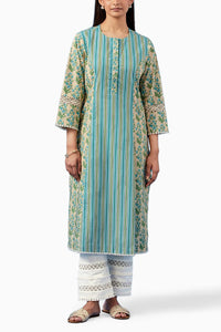 Featuring Lemon and Turquoise Malhaar lawn cotton kurta and palazzos with crochet lace detailing.