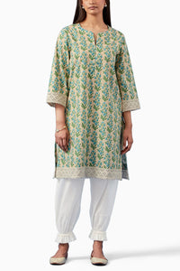 Featuring Lemon Badra lawn cotton kurta and palazzos with crochet lace detailing.