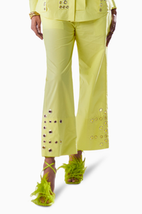 Featuring the Lemon Loaf Pants from House of Zeniaa's Mamma Mia Collection. These yellow cotton pants perfectly complement our Lemon Loaf Shirt. With a straight fit and fully elasticated waist for easy wear, they feature rivet pattern placement at the hem to match the shirt.
