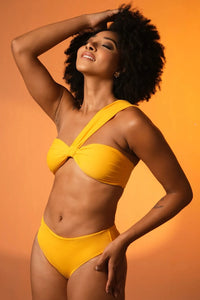 Zesty lemon one-shoulder bikini with gentle ruching for a fresh, flirty silhouette. Crafted using premium Italian Carvico fabric, this piece offers excellent stretch, resistance to chlorine and abrasion, UV protection, a quick-dry finish, and an incredibly soft hand feel — blending performance with luxury.