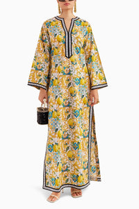 Introducing the Lemon Printed Relaxed Fit Kaftan, featuring a stylish mandarin collar and elegant bell sleeves with slits on both sides for added flair. The design is beautifully enhanced with black and white polka dot detailing along the neckline, sleeves, hem, and slits, creating a playful yet sophisticated look. Perfect for effortless style on any occasion!