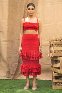 Introducing Lena a stunning red coord set that's perfect for a date night or Resort Party. This knitted ensemble features a chic blouse paired with a tiered skirt, adorned with beautiful floral lace and checkered fabric details. The combination of textures and vibrant red hue makes Lena both romantic and elegant, ensuring you stand out on any special occasion.