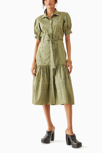 Leni dress in Lanes print. The sheath fitted dress with a gathered panel, uses the direction of the lanes print to create a unique pattern play. The collared dress with short puffed sleeves and belted waist is a fun day dress for a brunch or hilday