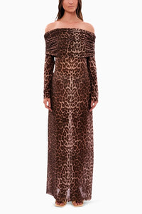 A slightly sheer lycra mesh dress with off-the-shoulder design, offering a sensual and elegant silhouette. The stretchy fabric perfectly hugs the curves for a chic and bold look.