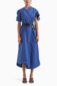 Les facettes drapeado stripes dress from Notre Ame gets its name from artistique stripe facettes. Handcrafted in fine cotton stripes, this dress is a work of meticulous craftsmanship, exuding a sophisticated elegance in its demeanor. The leather belt is used for styling purposes. This dress comes with a cloth belt.