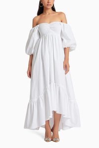Featuring Liberty Snow White Dress by Malie. This dress has an elasticated design across the chest and back, creating a snug fit at the torso, falling loosely in tiers over the stomach and hips. Its versatile sleeves can be worn on or off the shoulder, offering flexibility in styling.