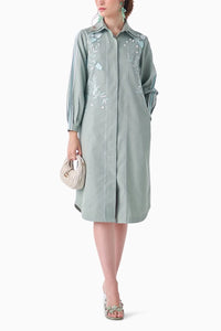 Crafted from cotton denim, this Sao light green dress features delicate denim thread embroidery with leaf appliqué on the front. Designed with side pockets, stitch lines, and tape details, it offers a straight-fit silhouette that blends casual charm with subtle artistry.