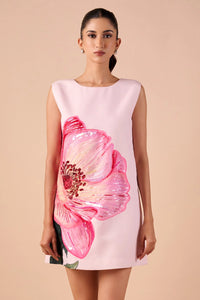 This sleeveless shift dress is a refined statement piece crafted in structured canvas, featuring a striking placement orchid print that commands attention. The oversized bloom is brought to life with intricate embroidery accents, adding depth and texture to the artwork. Clean lines, a high neckline, and a minimalist silhouette allow the bold print and fine detailing to stand out. Elegant yet impactful, this piece is a fresh and artistic take on modern femininity.