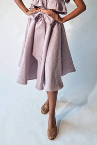The bow caught her attention - it was oversized and unexpected! The quilted surface drew one in closer, tracing the lines of the embroidery along its geometric surface. It dawned upon me the skirt had no can-can the structure of the skirt was only because of the quilting - this means it was lighter and easier to wear than other skirts in that silhouette. She knew she had to have it.