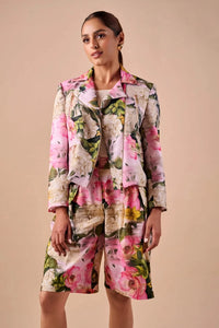 Elevate your wardrobe with this statement biker jacket, featuring an in-house developed floral smudge print that blends bold artistry with contemporary edge. Crafted with precision, the jacket showcases a vivid array of florals in rich hues of pink, ivory, and green, creating a painterly effect that’s both romantic and rebellious. Designed with classic biker elements like a structured collar and tailored silhouette, this piece merges timeless style with modern flair — perfect for making a chic impression.