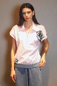 Featuring Light Pink Bomber by Richa Goenka, this chic statement jacket blends playful charm with a sporty edge. Crafted with black-and-white striped elastic trims and distinctive standing tube work, it is highlighted by one bold oversized flower and a delicate smaller bloom for a perfectly balanced, standout finish.