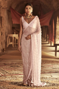 Featuring the Light Pink Nadira Saree Blouse by ITRH's Tirth collection. This exquisite set includes a silk organza and pure crepe saree adorned with crystal droplets and handmade lampi strips on the body. The sleeveless blouse is crafted in luxurious raw silk.