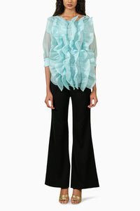 This light-teal ruffled body top in an organza base features elegant 3/4th pouf sleeves and soft, romantic texture. Perfect for brunch dates and chic daytime outings, it offers a breezy yet refined look. Style it with tailored trousers or a flowy skirt for effortless sophistication.