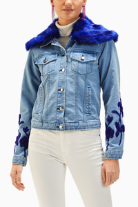 Elevate your style with our Light Wash Blue Fur Embellished Denim Jacket. Crafted from comfortable stretch denim, it adds a touch of luxury to your casual look.