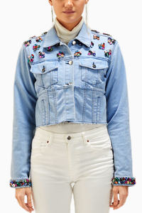 Light Wash Multicolor Stones Embellished Crop Jacket