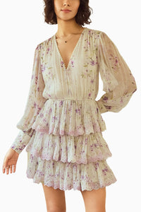 Featuring the Lilac Cherry Blossom Tiered Mini Dress from Roseroom's Spring 2024 Collection. This adorable short tiered dress, crafted from French chiffon, showcases a delightful cherry blossom lurex print in lilac. It features charming scalloped threadwork lace for an elegant finish.