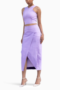 Best in edgy fashion, our Lilac Denim Set features a crop top and mid-length skirt in a soft lilac hue. The armor style top and draped skirt offer a perfect blend of grunge and femininity. With top stitch detailing and superb hand craftsmanship, this set stands out as a unique and stylish addition to any wardrobe. Top Length: 15 inches Skirt Length: 34 inches