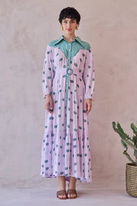 A dreamy fusion of vintage charm and contemporary quirk, this lavender-hued dress is crafted in soft chanderi silk and adorned with whimsical teal block prints. Its standout features—a broad contrast collar, delicate fabric-covered buttons, and a cinching belt with a fabric-wrapped buckle—lend an elevated edge to its romantic, floaty silhouette. The tiered hem and gathered seams offer ease and volume, while full sleeves with buttoned cuffs balance structure and softness. Perfect for breezy brunches or quiet escapes, this piece makes a gentle yet confident statement.