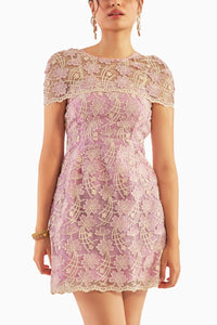 Introducing the Floral Organza Embroidered Short Dress, complete with a stylish detachable cape. The dress features elegant straps, a side zip for ease, and lovely scalloped detailing at the hem. The short cape, also adorned with scalloping, includes a single top button at the back, adding a sophisticated touch to this chic ensemble!