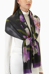 Our collection of Shawls in 100% Merino Wool for modern and resourceful women. The entirely hand-painted scarf with painterly flowers is characterized by a size of 70 x 180 cm. A classic wool fabric with a contemporary print where every piece is unique. Perfect to be wrapped around the neck and wear it in a casual and contemporary way.