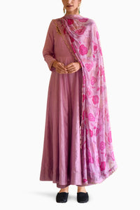 Encapsulate this festive season with our rustic pink color anarkali adorned with subtle beadwork and sequin detailing in front and on sleeve edges. Fitted at the bust and flared at the bottom, it has an elongated U-neckline, and three-quarter sleeves and is paired with solid matching straight pants and foliage printed chiffon dupatta featuring cut work all over the border and sequin hand work on it.