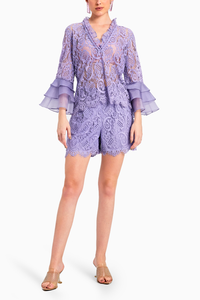Featuring Lilac lace top and shorts with organza ruffled detailing.