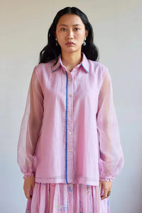 Introducing the handwoven Chanderi relaxed-fit shirt, elegantly adorned with a bold blue border along the front, framing sophistication with every view. Whispers of sheer refinement unfold through organza silk sleeves—light, airy, and bold. A perfect blend of texture, charm, and grace, where timeless craftsmanship meets modern elegance.