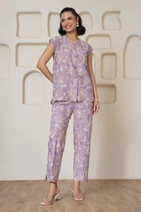 A sophisticated taupe two-piece set featuring delicate beige floral embroidery, a V-neck button-front tunic top, and matching bottoms, perfect for an elegant yet comfortable look.