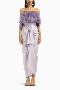 Our signature draped skirt that's cut in a pencil fit. The front drape gives a flattering look to the body and can be worn with a shirt or your favorite top. The satin sheen makes it a great option for a night out. Closes on the side with a concealed zip. Wear with your favorite diamonds and heels for a head-turning ensemble.