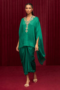 Featuring the Lilt Cape Skirt Set from Ridhi Mehra's Jazz-A-Jashn Collection. This stunning ensemble features a bottle green fine silk cape paired with a flowing cotton silk drape skirt. Exuding elegance and sophistication, it's perfect for any occasion. Elevate your style effortlessly!