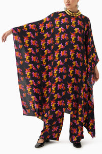 The Lily Kimono Kurta & Trousers Co-ord crafted from Studio Rigu's stunning vegan silk fabrication, this trans seasonal piece is a statement. Made in our statement lily hand painted print which is digitally blurred, this set is a trend setting piece. With a Free Size Kimono Style Kurta and casual fit straight trousers, the set has an interplay of colors and Swarovski Embroidery detail. Matched with straight trousers which have a front opening and pockets. Pair it will heels for an elegant look.