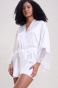A must-have for every woman, this white satin robe combines comfort with elegance. Featuring delicate 3-D Rose embroidered tulle sleeves, it’s designed for effortless elegance. Designed specially with luxury fabrics with great attention to detail and made ethically in our atelier. The robe reaches just above the knees, making it perfect for lounging or adding a chic layer to your nightwear. Complete with a tie closure for an adjustable fit, this robe flatters every body type. Whether for special occasions or everyday wear, this piece is both stylish and comfortable.