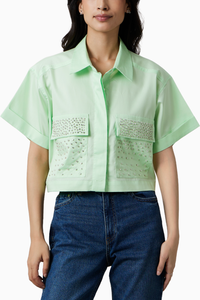 Featuring the Lime Crop Shirt with Swarovski Studs – a refreshing twist to your ensemble. This shirt boasts a boxy fit, classic collar, and concealed button placket, with trendy half sleeves. Its embellished chest pocket adds a touch of sparkle and sophistication to your look.