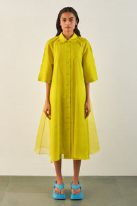 Featuring a vibrant lime organza button-down raglan dress with a crisp collar, this statement piece brings a fresh, modern twist to sheer layering. Light and ethereal, it includes a coordinating lime silk slip for a perfect for daytime elegance.