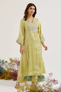 Fabric- Tissue Color- LIme Embroidery- Aari Embroidery Fit- Relaxed Fit Size Worn by Model- S Model Height- 5'5 Components- 2 Product Code- SVENEROSTKS28