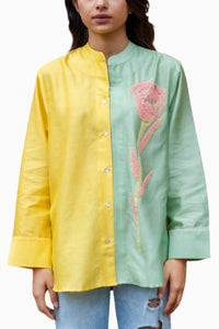 Featuring Lime Green & Yellow Bridget Shirt by URAIB from The Colored Castle Collection. Tailored from cotton-poplin fabric, this shirt boasts a bold and stylish look with its captivating hand embroidered rose, ensuring a distinctive wardrobe essential.