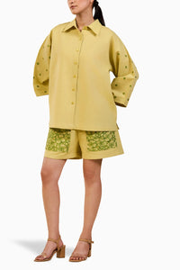 Lime Green Co-ord Set features a shirt adorned with long, loose embroidered sleeves and shorts detailed with delicate cutwork pockets. Perfect for the summer, this ensemble effortlessly combines sophistication with a chic, laid-back vibe, ensuring you stay cool and stylish all season long.