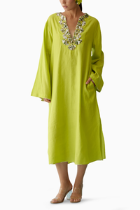 Featuring the Lime Green Fabric Ribbon Embroidery Flower Kaftan by Nikasha. Embrace vibrant elegance with a lime green kaftan adorned with fabric ribbon embroidery flower and meticulous hand-stitched details, crafted from 100% cotton. Elevate your style with this unique and chic piece.