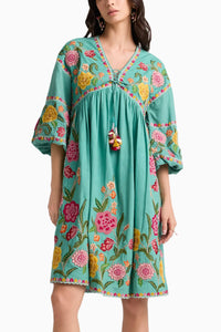Featuring an aqua embroidered gathered dress by Chandrima's Florens collection. Crafted from Kala cotton, known for its eco-friendly and sustainable qualities, this dress will look beautiful and also reflect a commitment to ethical fashion.
