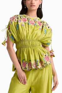 Featuring a lime green chanderi floral bead and cutwork top by Chandrima's Florens collection. Ruched detailing adds texture and interest to the garment, with gathers of fabric creating flattering draping and subtle volume.